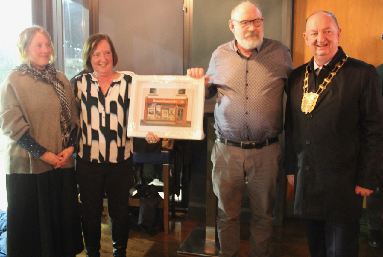 Gerard and Siobhan Boylan of Skerries Frameworks with Mayor Tom O’Leary and artist Kristina Keegan